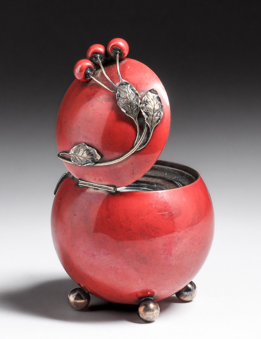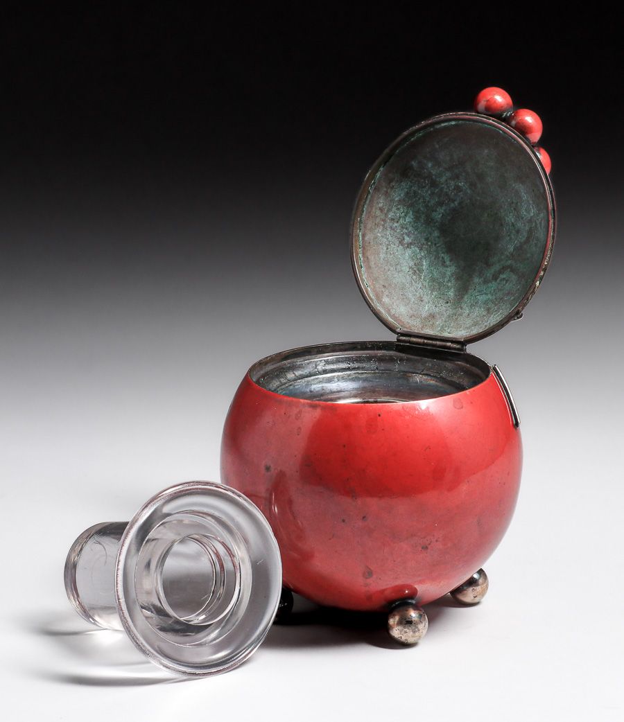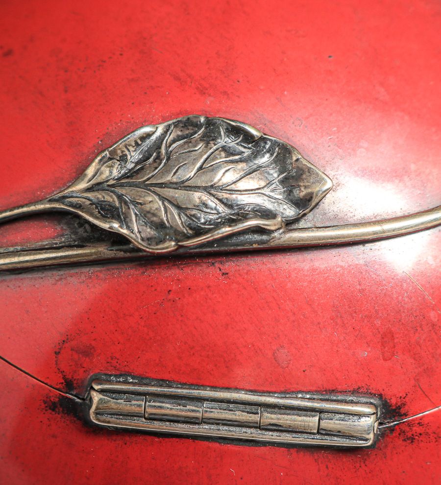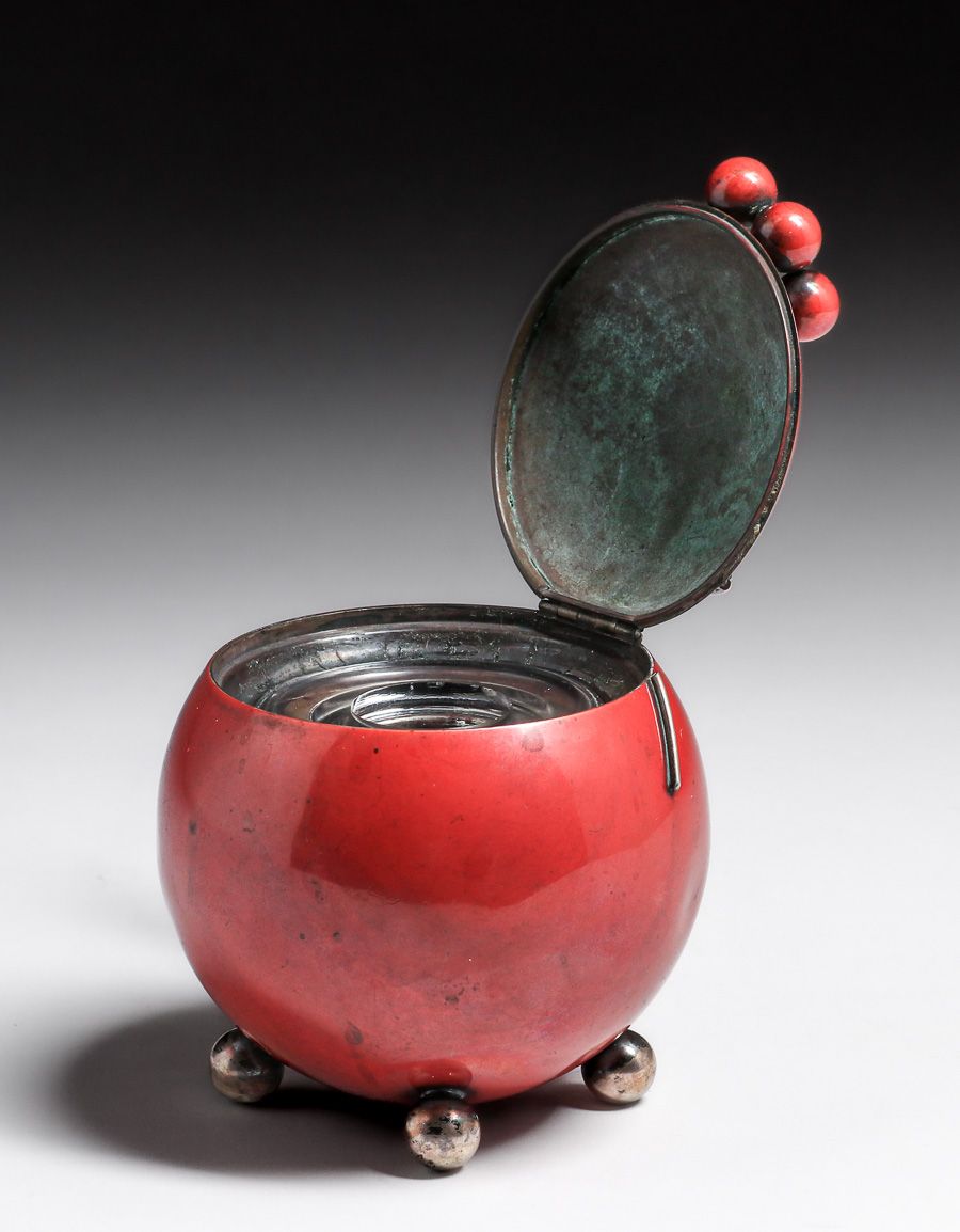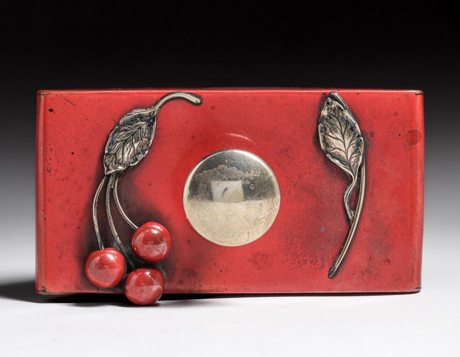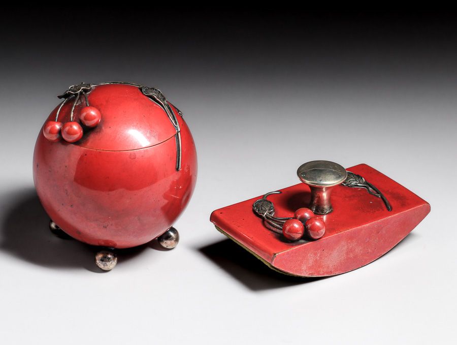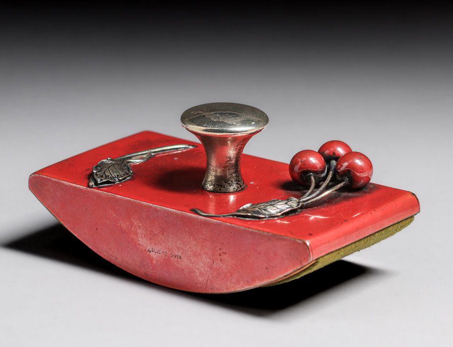 La Pierre Mfg. Co. Copper & Silver Inkwell & Rolling Blotter c1900. La Pierre Mfg. Co. was located in New York and Newark, NJ. Signed. Fantastic original red patina. Rolling blotter measures 5″w x 2.75″ x 2.25″h SOLD