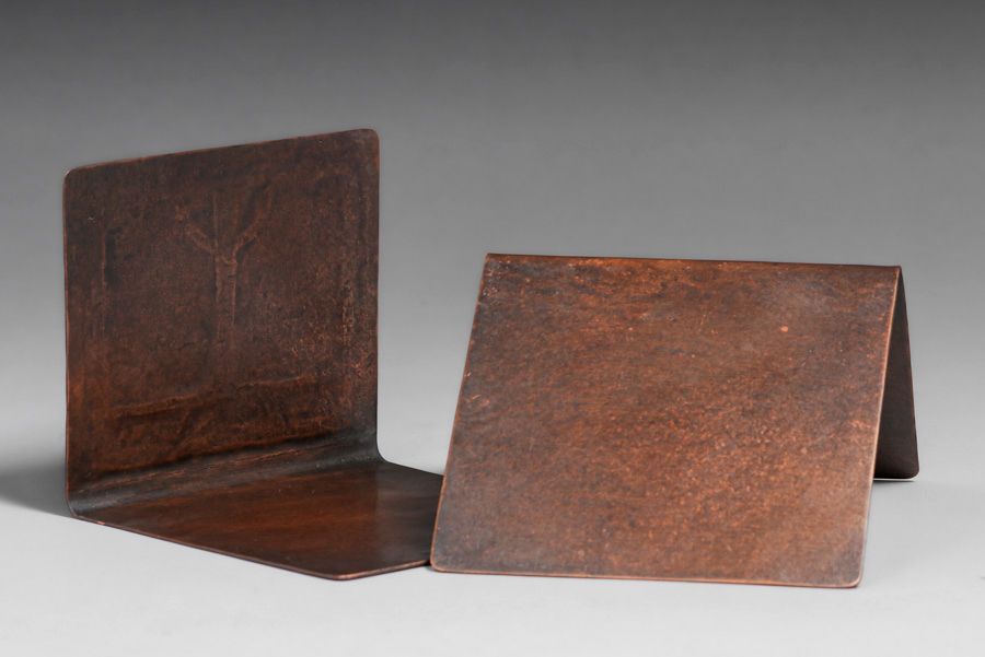 Minneapolis Handicraft Guild - attributed Acid-Etched Bookends c1910. Unsigned. Excellent new patina. 4.5"h x 5 3/8"w SOLD