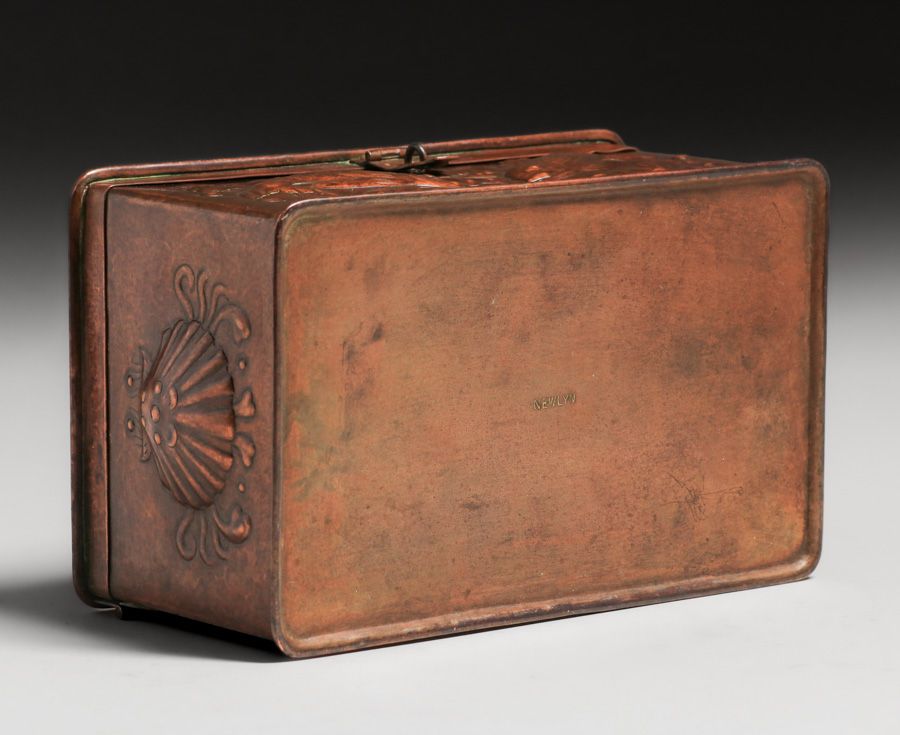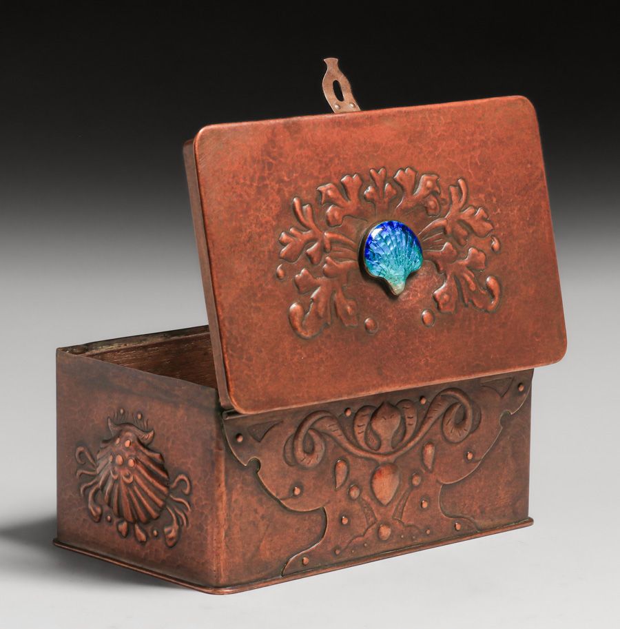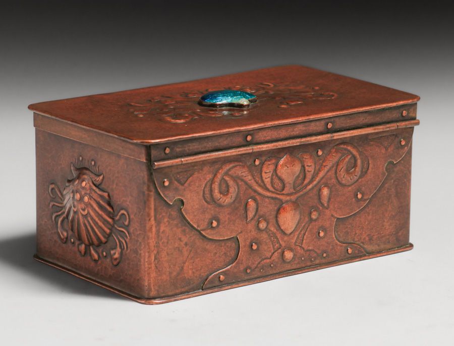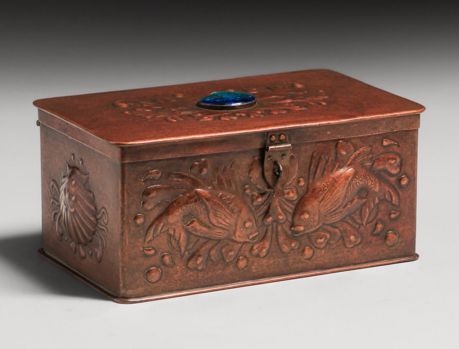 Newlyn Hammered Copper & Enamel Fish & Sea Creature Box c1900. Newlyn copper pieces with enamel are extremely rare. Signed. Excellent new patina. 8.5"w x 5.25"d x 4.25" SOLD