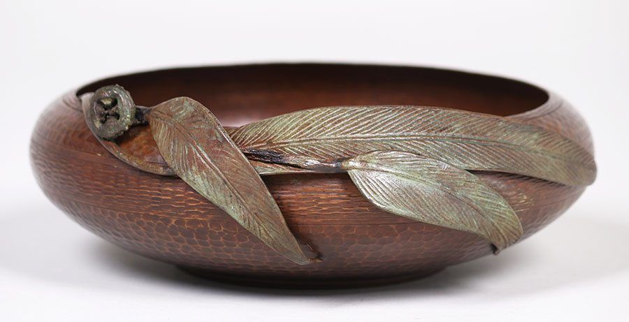 Old Mission Kopper Kraft hammered copper bowl with applied bronze eucalyptus leaves c1922-1925. Signed. Excellent new patina. 9"d x 3"h SOLD