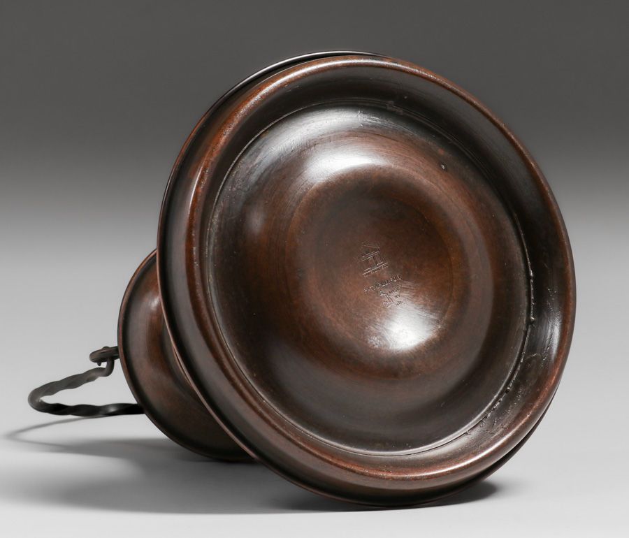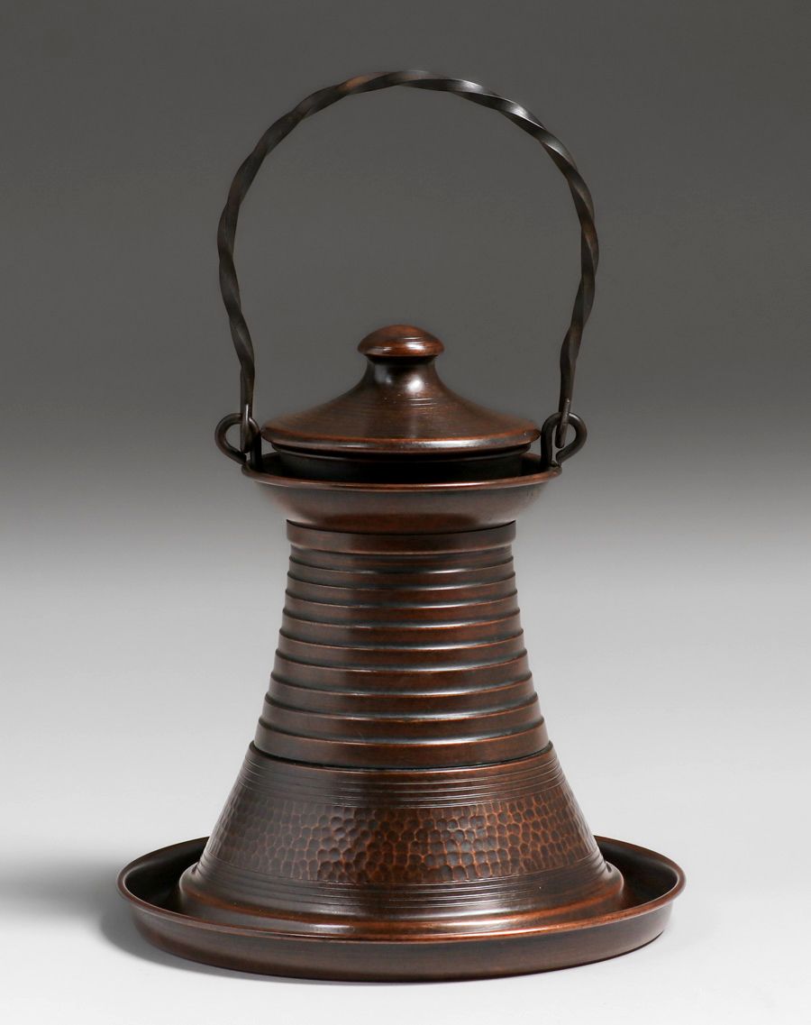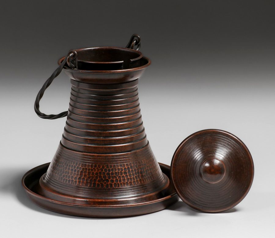 Old Mission Kopper Kraft Hammered Copper Fire Starter Bucket c1922-1925. Signed. Excellent new patina. Does not include fire starter poker. 12.5h with handle. 9h x 7.5d inches SOLD