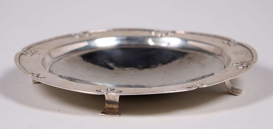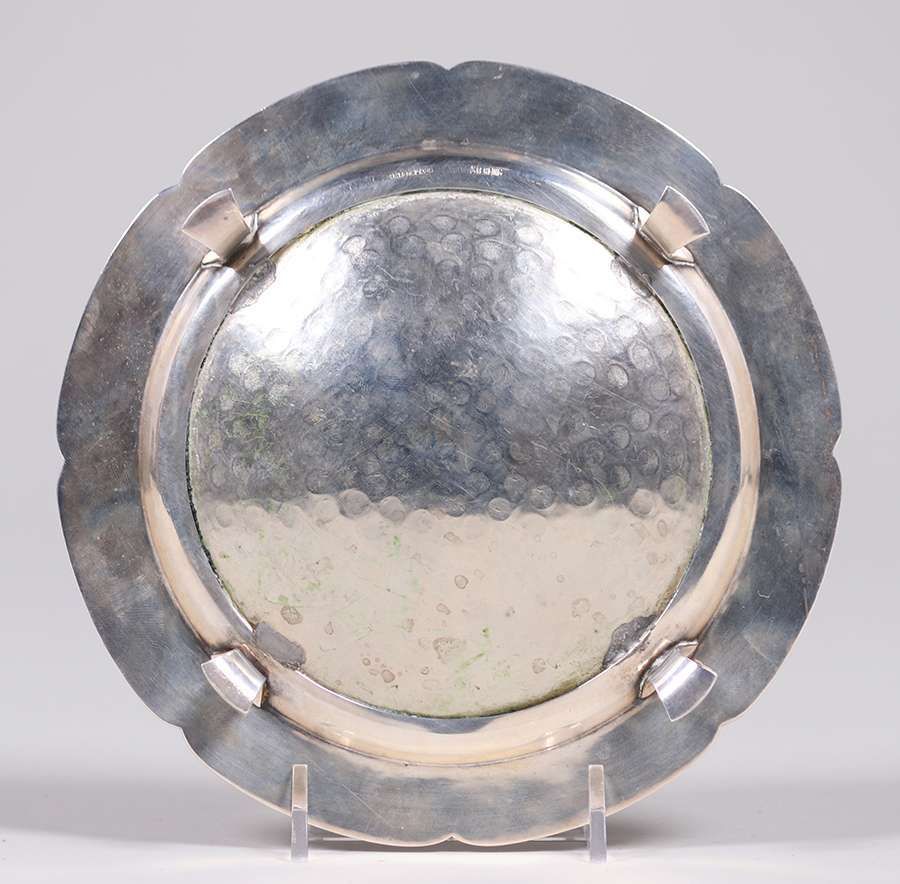 Robert Mills , Oakland, CA hammered sterling silver tray similar to Shreve & Co c1920s. Perfect condition. Mills was a partner in Mills & Burnley of Oakland, CA and previously worked for Shreve & Co in San Francisco. 7"d SOLD