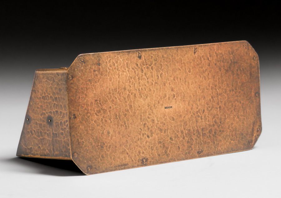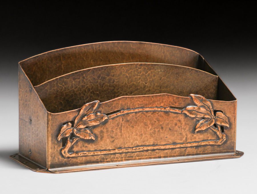 Rokesley Shop - Cleveland, Ohio Cutout Hammered Brass Letter Rack c1910. Signed. Excellent new patina. 10 3/8"w x 4 5/8"d x 5 1/8"h SOLD