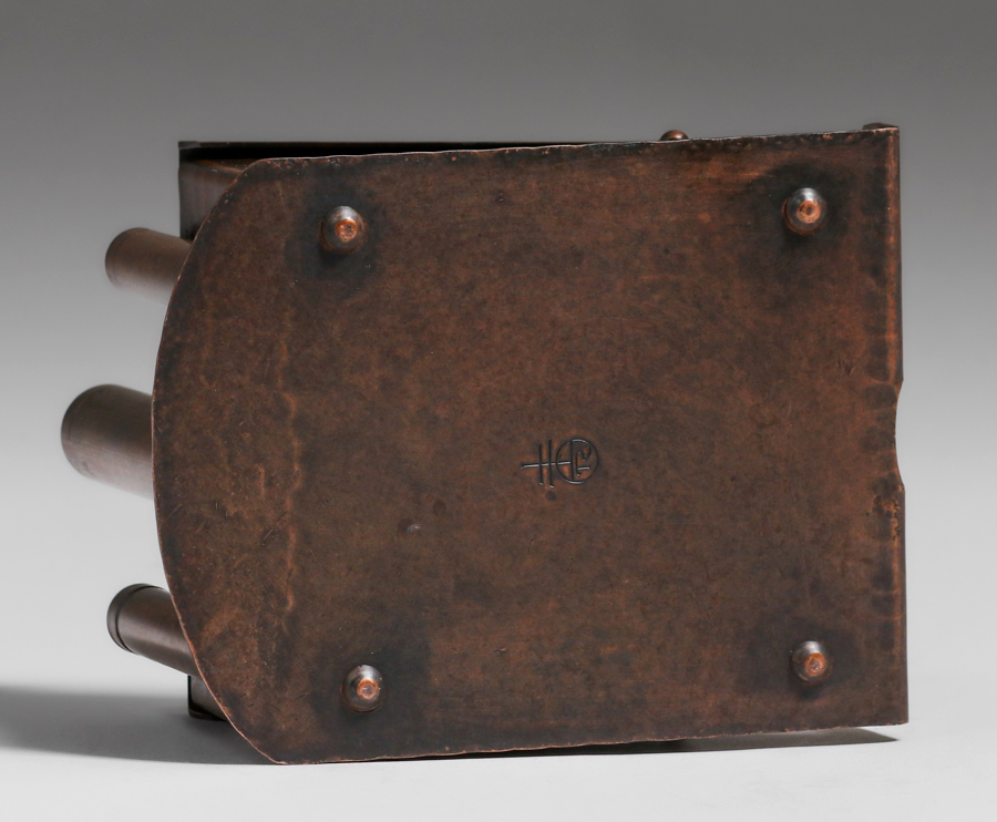 15003. Roycroft Hammered Copper Desk Calendar Organizer c1915.  Signed.  Excellent new patina.  Comes complete with full set of calendar inserts. 4.75 x 3.75w x 2 5/8h inches SOLD