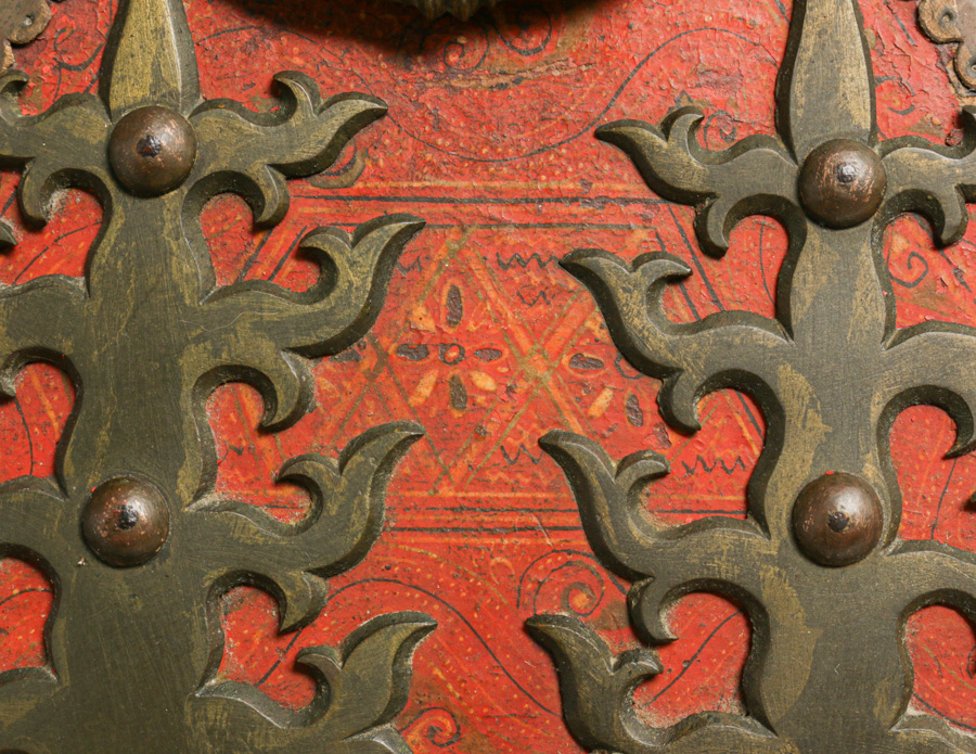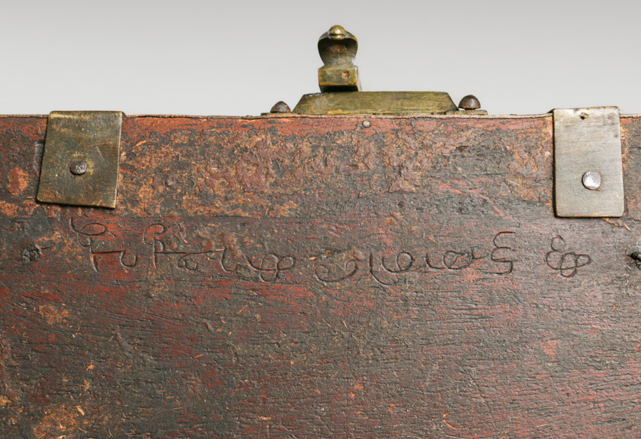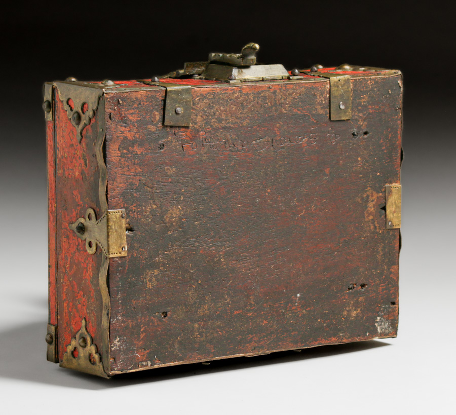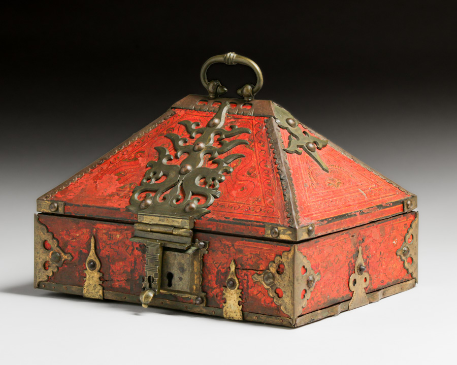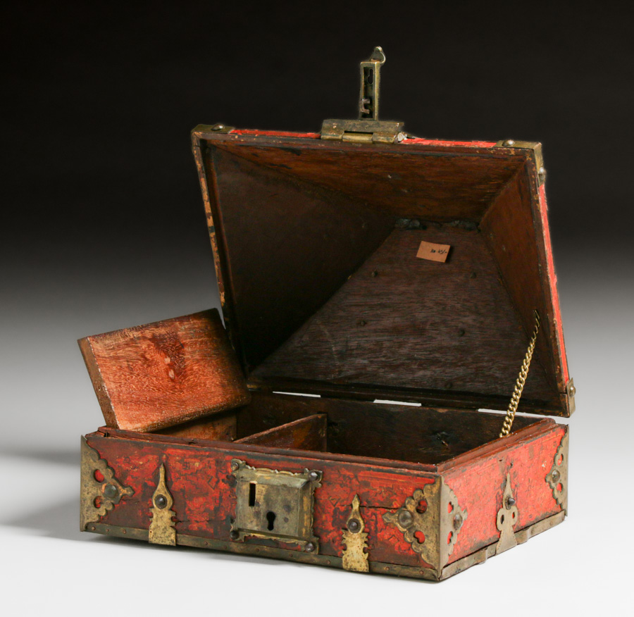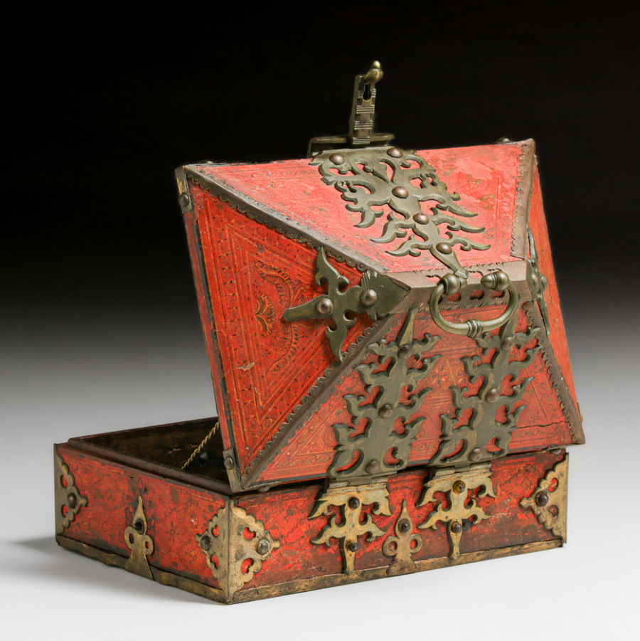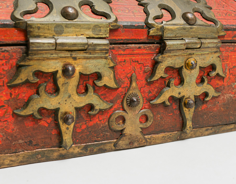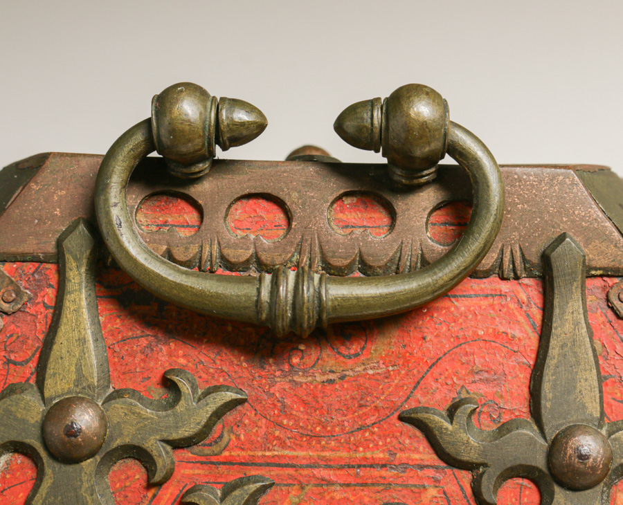 21737. South Indian – English Aesthetic Movement Influenced Brass & Lacquer Casket c1900. Unsigned. Excellent original painted lacquer and original patina to brass strap work. 10.5″w x 8.5″h with handle x 8″d $750