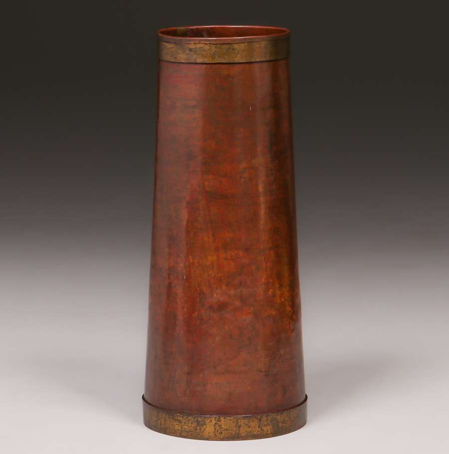 Thomas McGlynn Hammered Copper & Brass Vase c1912. Unsigned. Provenance: McGlynn Family. Excellent original patina. McGlynn was an artist in San Francisco, worked as chief draftsman for Arthur Mathews' Furniture Shop and was a designer for Dirk van Erp. He became quite competent as a metal smith but never pursued the craft. McGlynn is credited for having designed the oak tree cutout motif occasionally seen on van Erp pieces. 14"h x 5.75"d $3800
