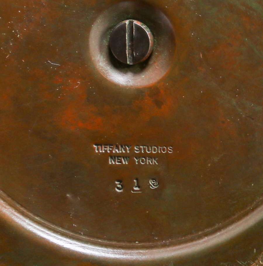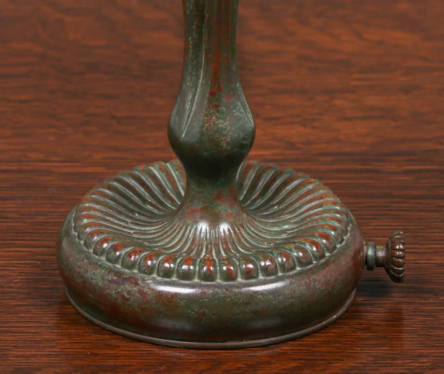 Tiffany Studios Three-Light Lily Lamp c1910. Signed. Contemporary Lundberg Studios Glass Shades. Excellent original patina. 13"h x 4.25"d base SOLD