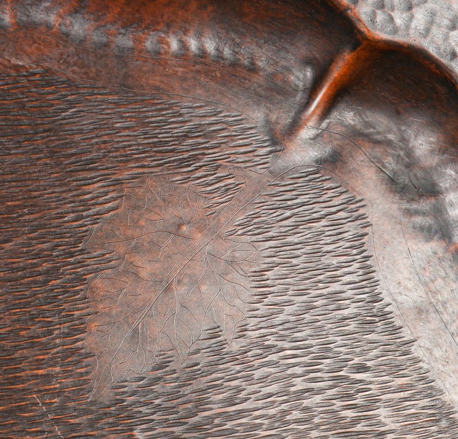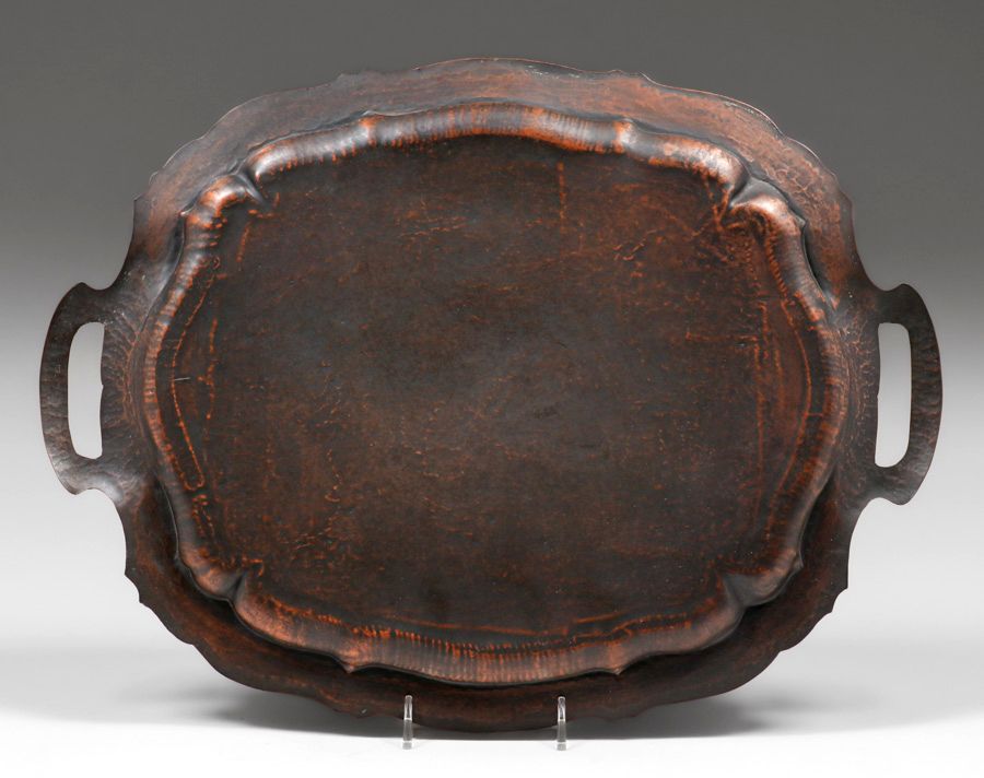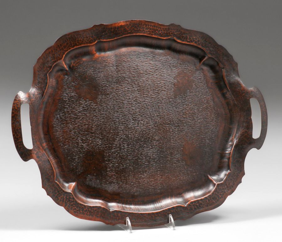 - William H. Pohlmann (1872-1938) Hammered Copper Two-Handled Grapeleaf Radial Sillouette Tray c1905