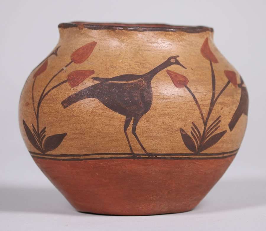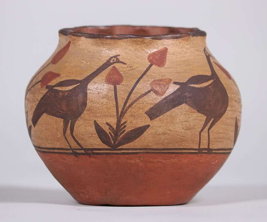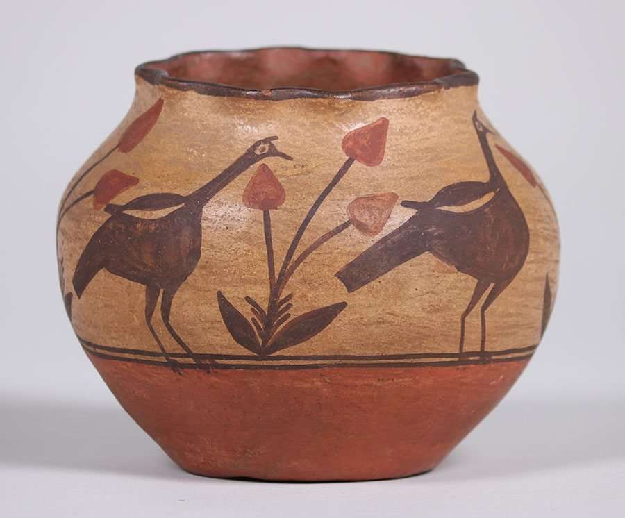 Zuni Pueblo unusual vase with Turkey motif c1920. Possibly Zia Pueblo marketed as Zuni. Signed "Zuni". A couple of very minor rim chips, otherwise excellent condition. 5"h x 6"w SOLD