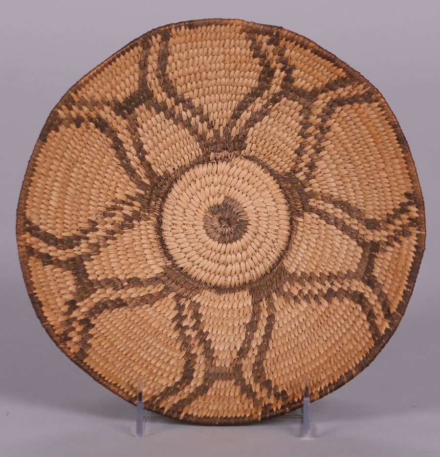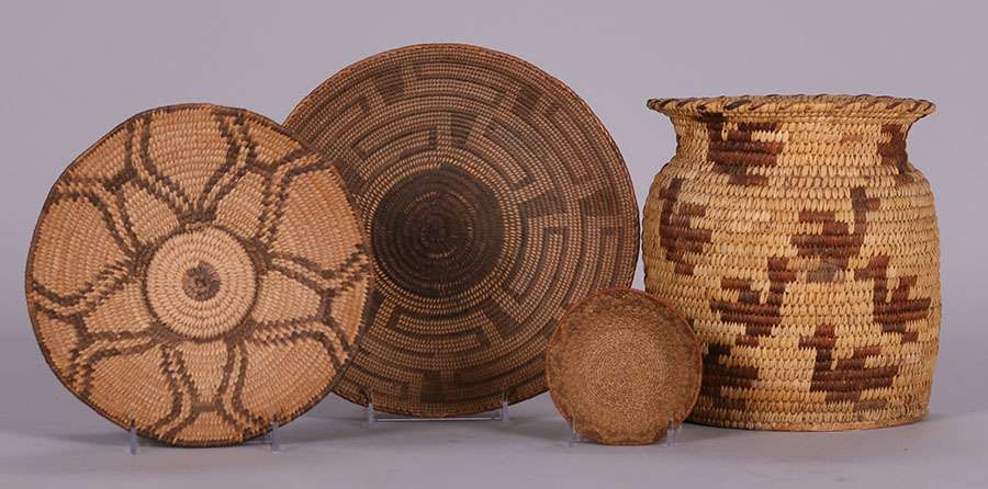 Native American baskets – Pima, Apache & Papago Tribes – Arizona – early 20th century. Pima raised basket 9.5"d x 4"h SOLD ; Apache basket 10.5"d x 3.5"h SOLD ; small Pima basket 4.5"d SOLD ; Papago basket with flying birds (some fraying to base) 9"h x 8"d SOLD