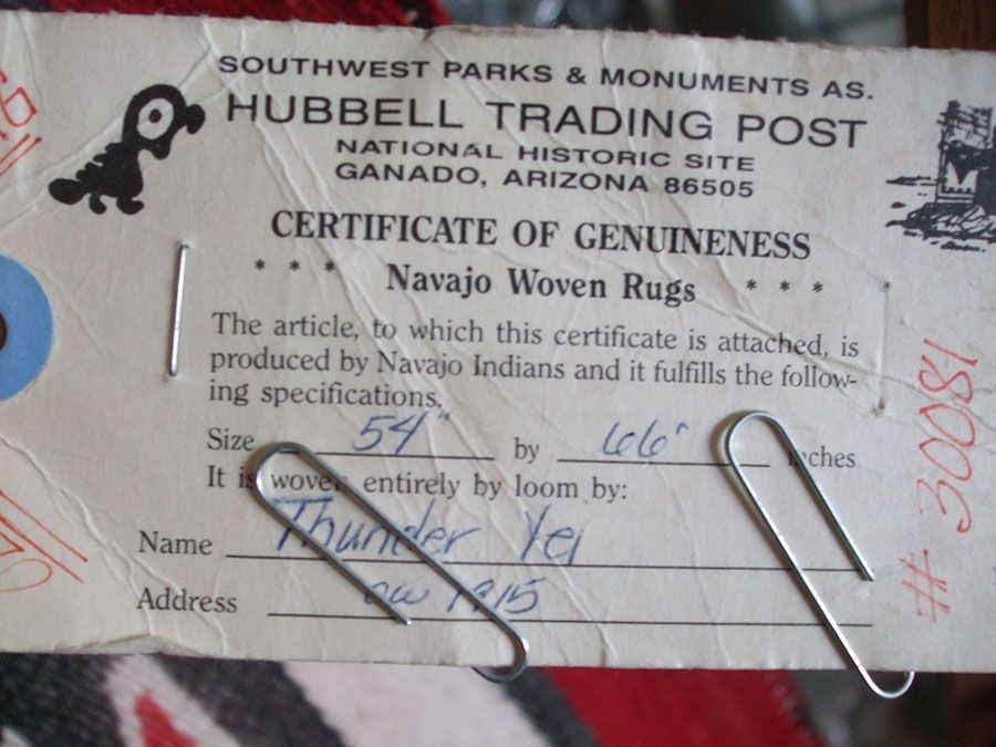 Hubbell Trading Post Navajo "Thunder Yei" Rug c1915. Comes with original Hubbell Trading Post Tag and sales receipt of $9000 from 30+ years ago. No color run. Near pristine condition. 66" x 54" SOLD