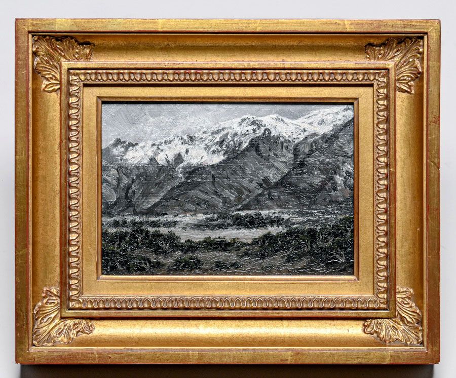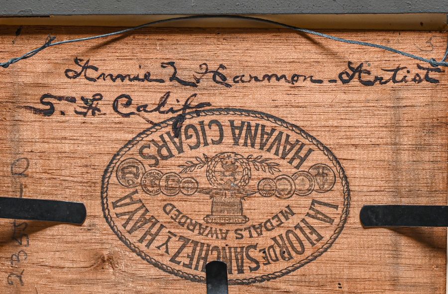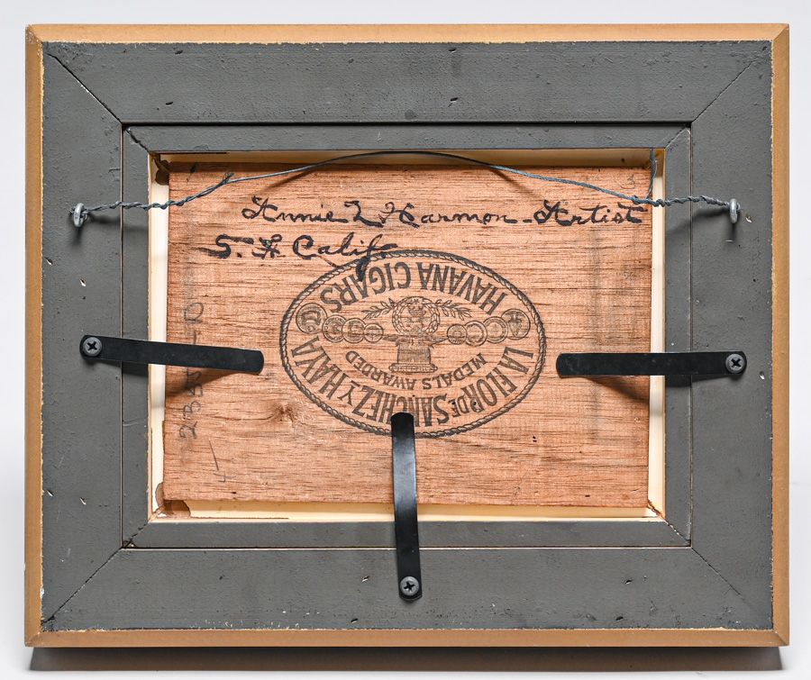 Annie L Harmon (1855-1930) California Sierras Cigar Box-Top Painting c1900. Signed. Excellent condition. 5.5"h x 8"w. Frame 10 1/8"h x 12.5"w SOLD