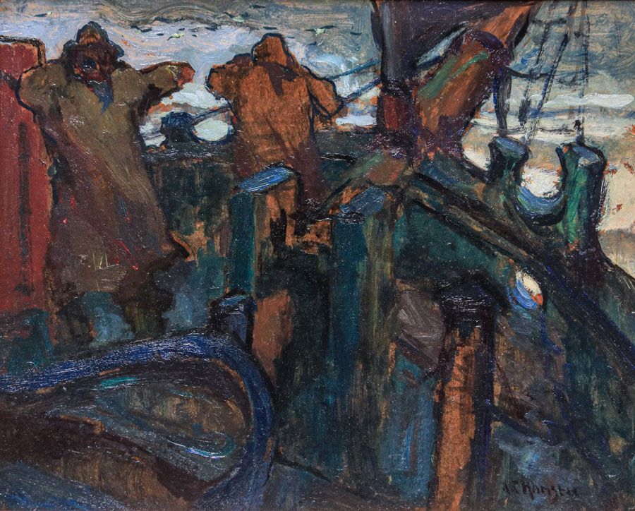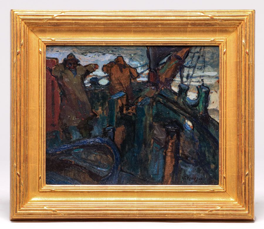 Armin Carl Hansen (1886-1957) Painting "Fish in Sight" c1915. Oil painting on board. Signed. Excellent condition. Hansen is quoted as saying, "Every move I have made and everything that I have done has always been to go back to the water and to the men who gave it its romance." 15.5"h x 19.5"w. Frame 23"h x 26 5/8"w SOLD