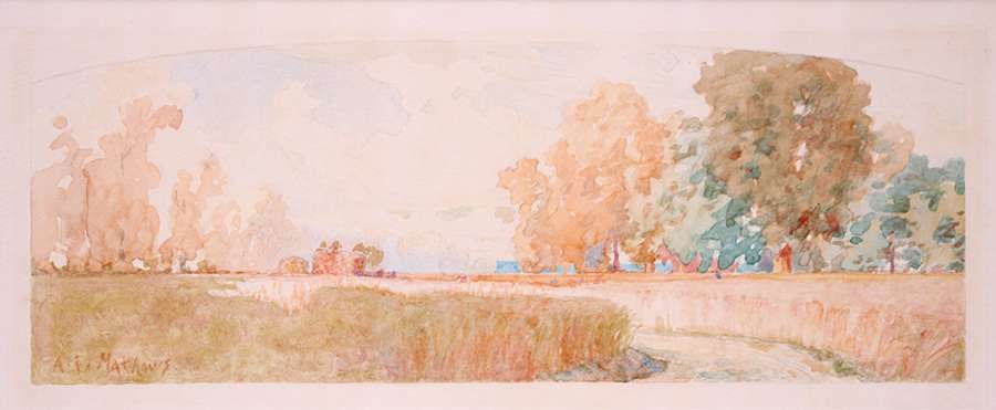 Arthur F. Mathews (1860-1945) watercolor study of river and tree c1890s. Signed "A.F. Mathews". Slightly faded, otherwise excellent condition. Tim Holton custom frame with UV filtered museum glass. 3 5/8"h x 9 7/8"w. Holton frame 15"h x 20.25"w SOLD