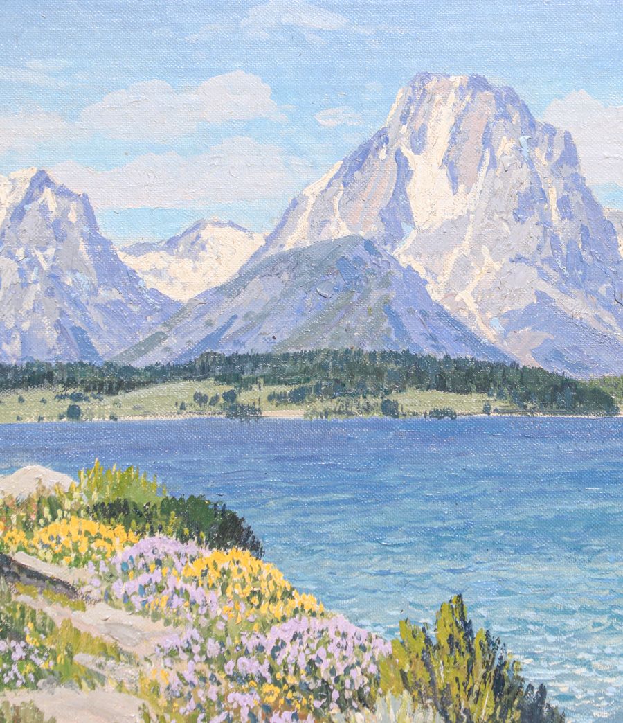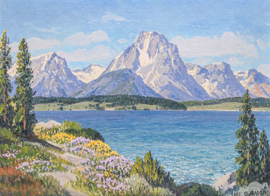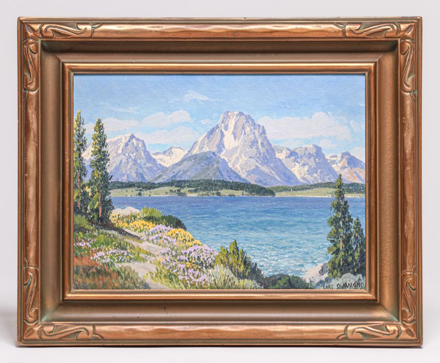 Carl Sammons (1883-1968) “Mt Moran – Jackson Lake – Teton Mountains, Wyoming” c1920s. Oil painting on board. Signed. Excellent condition. 12"h x 16"w. Frame 17.5"h x 21.5" $5500