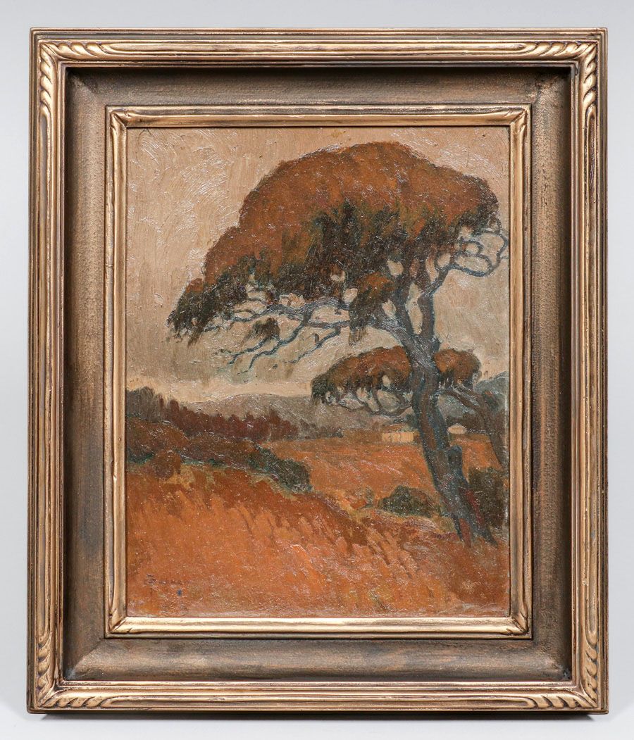 Charles Louis Turner (1867-1919) Painting Monterey Cypress Tree c1910. Oil painting on board. Turner studied with Arthur Mathews and was a member of the San Francisco Sketch Club. Signed. Excellent condition. 13”h x 10”w. Frame 18”h x 15.25” w SOLD