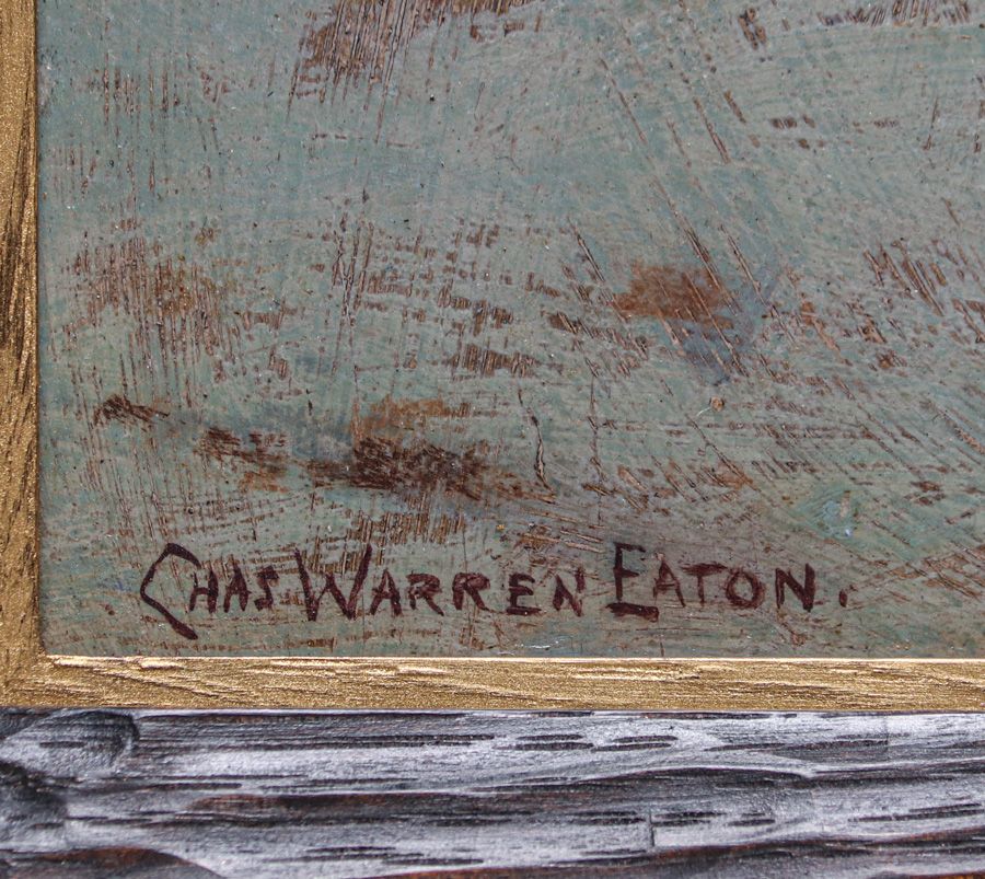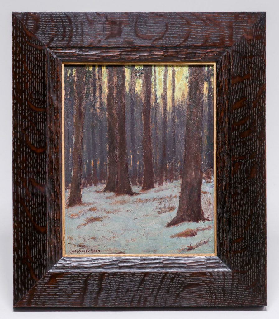 Charles Warren Eaton (1857-1937) Painting “Winter Woods" c1910. Exhibited Salmagundi Club. Signed. Excellent condition. Tim Holton custom hand-carved oak frame. 10"h x 8"w. Frame 15"h x 13"w SOLD