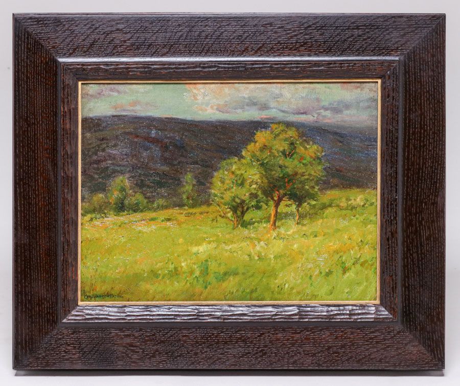 Charles Warren Eaton (1857-1937) Pastoral Landscape c1910. Oil painting on board. Signed. Excellent condition. Tim Holton custom hand-carved oak frame. 12”h x 16”w. Frame 18.5”h x 22.25”w SOLD