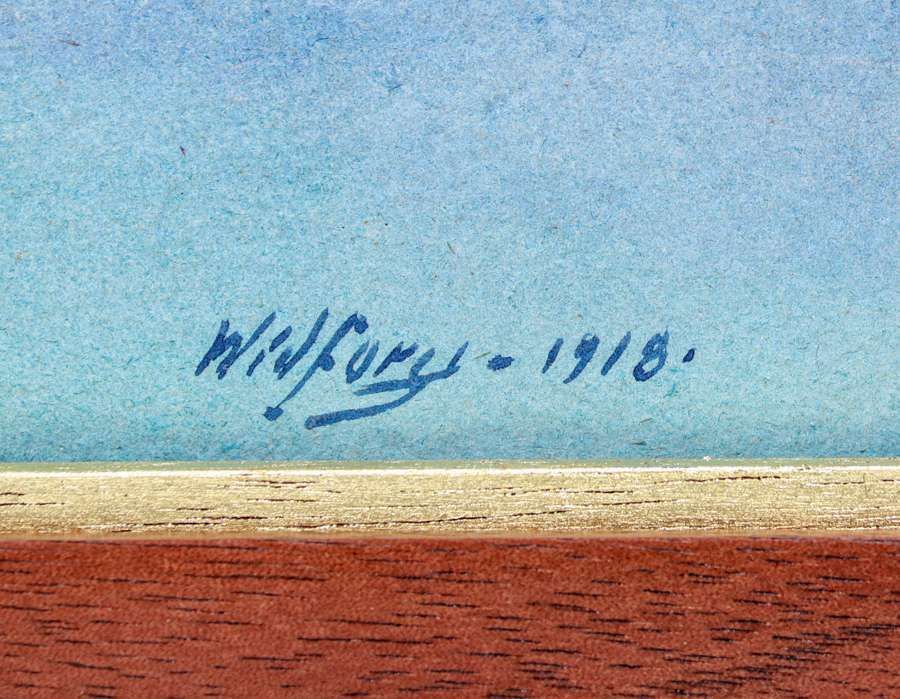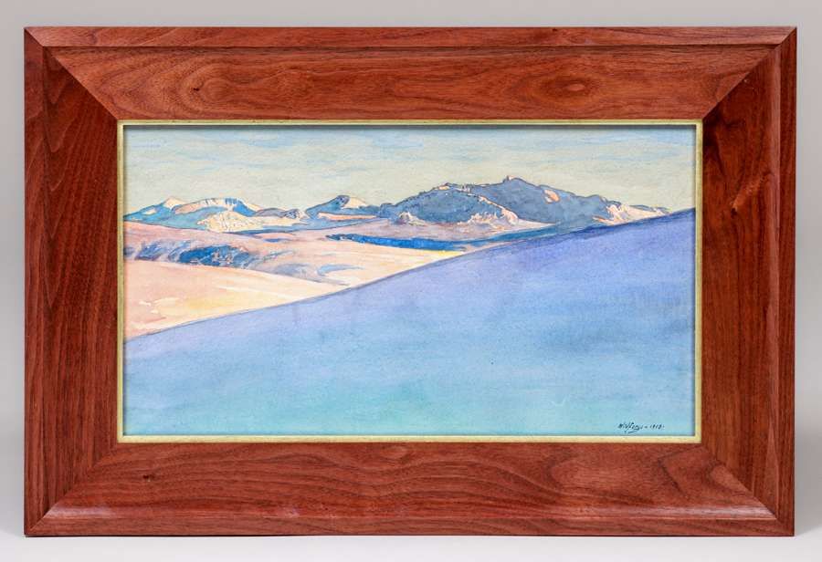 Gunnar Mauritz Widforss (1879 – 1934) Watercolor Kebnekaise Mountain Sweden 1918. Widforss is most noted for his watercolors of Yosemite and the Grand Canyon. This watercolor was painted towards the end of WWI while Widforss was in Sweden. He returned to America and in 1921 discovered Yosemite. His great watercolor paintings hang in the famous Ahwanee Hotel in Yosemite. Tim Holton custom walnut frame. 15.25″w x 8.75″h. Frame 21″w x 14″h SOLD