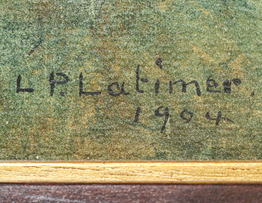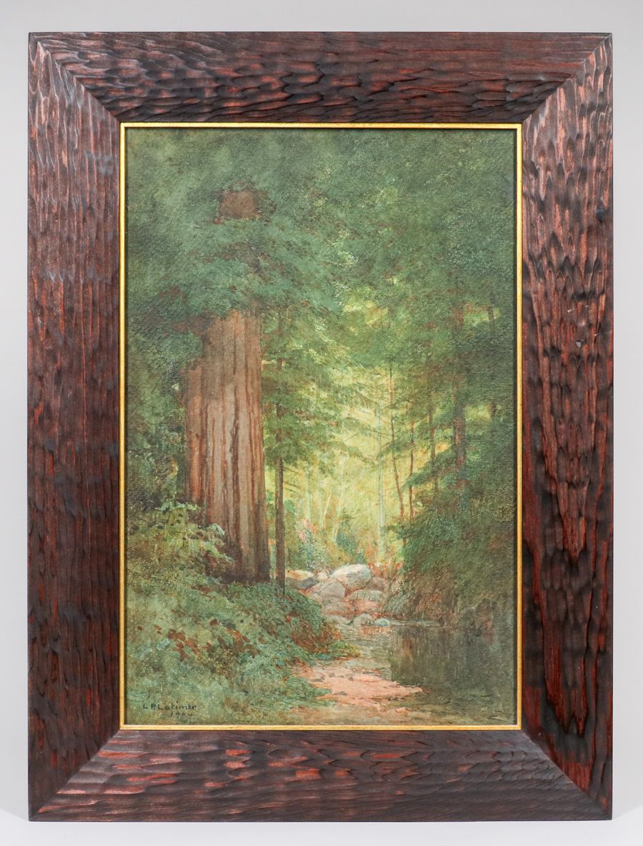 Lorenzo Latimer (1857-1941) Watercolor Stream Through the Redwoods 1904. Signed. Excellent condition. Tim Holton custom hand-carved redwood frame. UV filtered museum glass. 19.5h x 13w. Frame 26h x 19.5w inches SOLD
