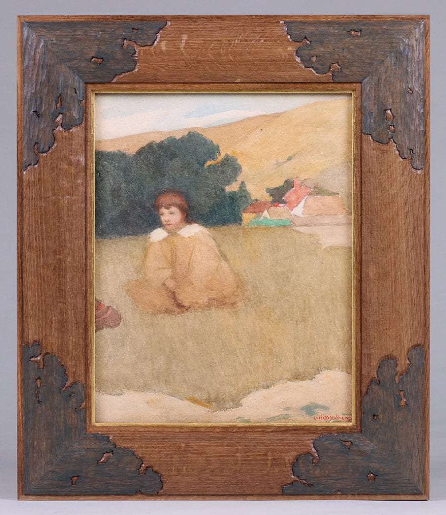 Lucia Mathews (1870-1955) watercolor on board "Portrait of a Young Girl Seated in a Meadow" c1914. Provenance: Gift from Mr. John Zeile (Furniture Shop co-owner) to Mrs. Lilla Elizabeth [Roe] McClellan and Mrs. Leon Lowell McClellan (Furniture Shop accountant), shortly after their marriage in 1914 to furnish their home. 14"h x 11"w. Tim Holton custom oak frame 20.5"h x 17.5"w SOLD