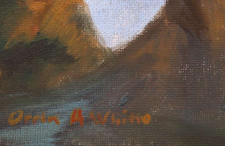 Orrin White (1883-1969) oil painting on board of Coastal Monterey Cypress Trees c1940s. Signed. Excellent condition. 11.5"h x 14.25"w. Frame 16.75"h x 18"w SOLD
