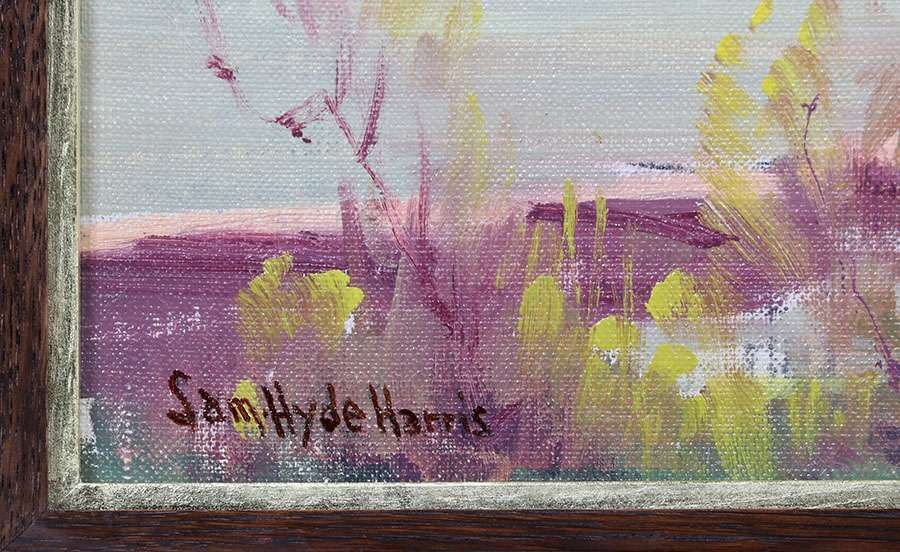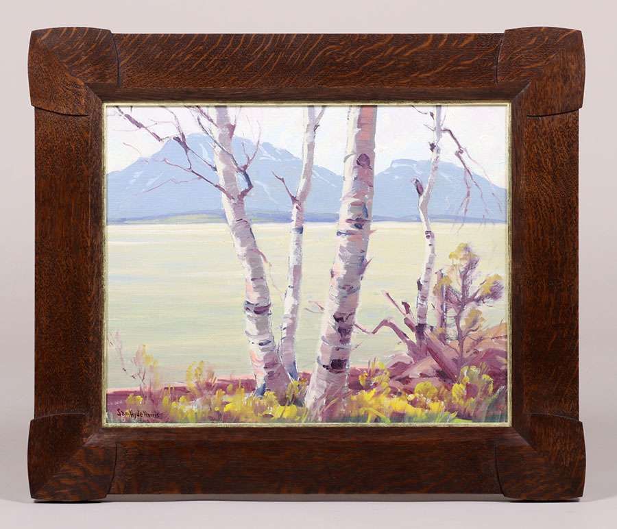 Sam Hyde Harris (1889-1977) oil painting on board Lakeside Birch Trees. Signed. Excellent condition. Tim Holton custom oak frame. 15.5"h x 19.5"w. Frame 23"h x 27"w SOLD