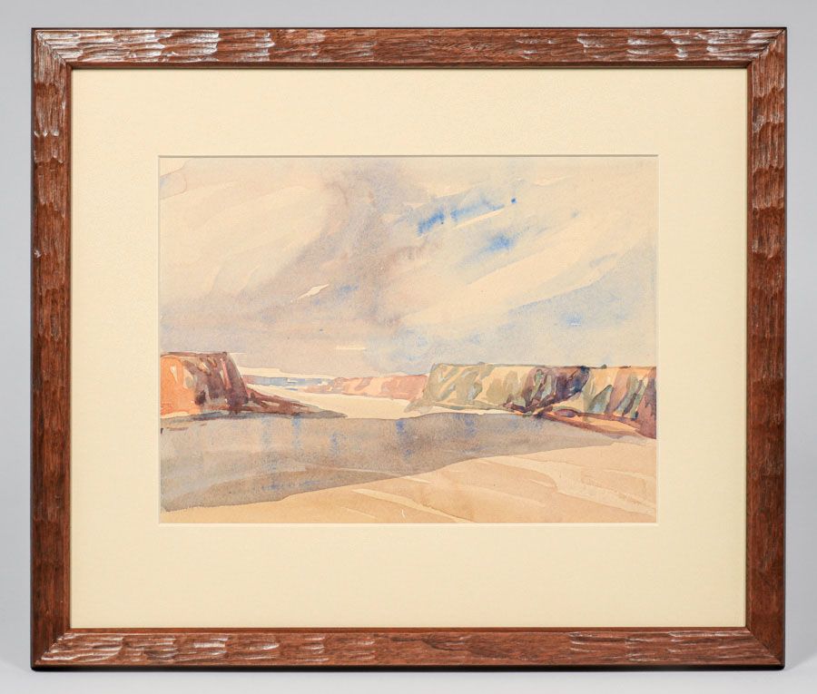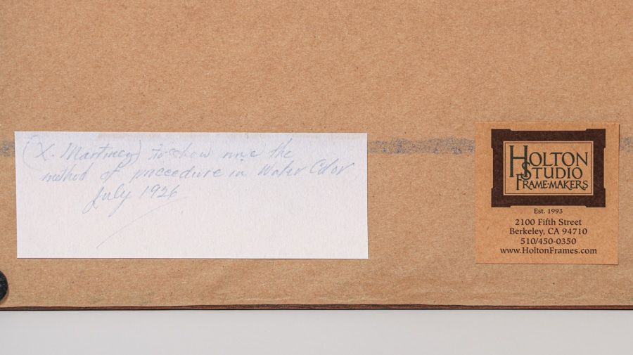 Xavier Martinez (1869-1943) Southwest Watercolor 1926. Signed on back. Excellent condition. Provenance: Xavier Martinez Estate. Tim Holton custom hand-carved frame. 8.5"h x 11.5"w. Frame 14 7/8"h x 17.5"w SOLD