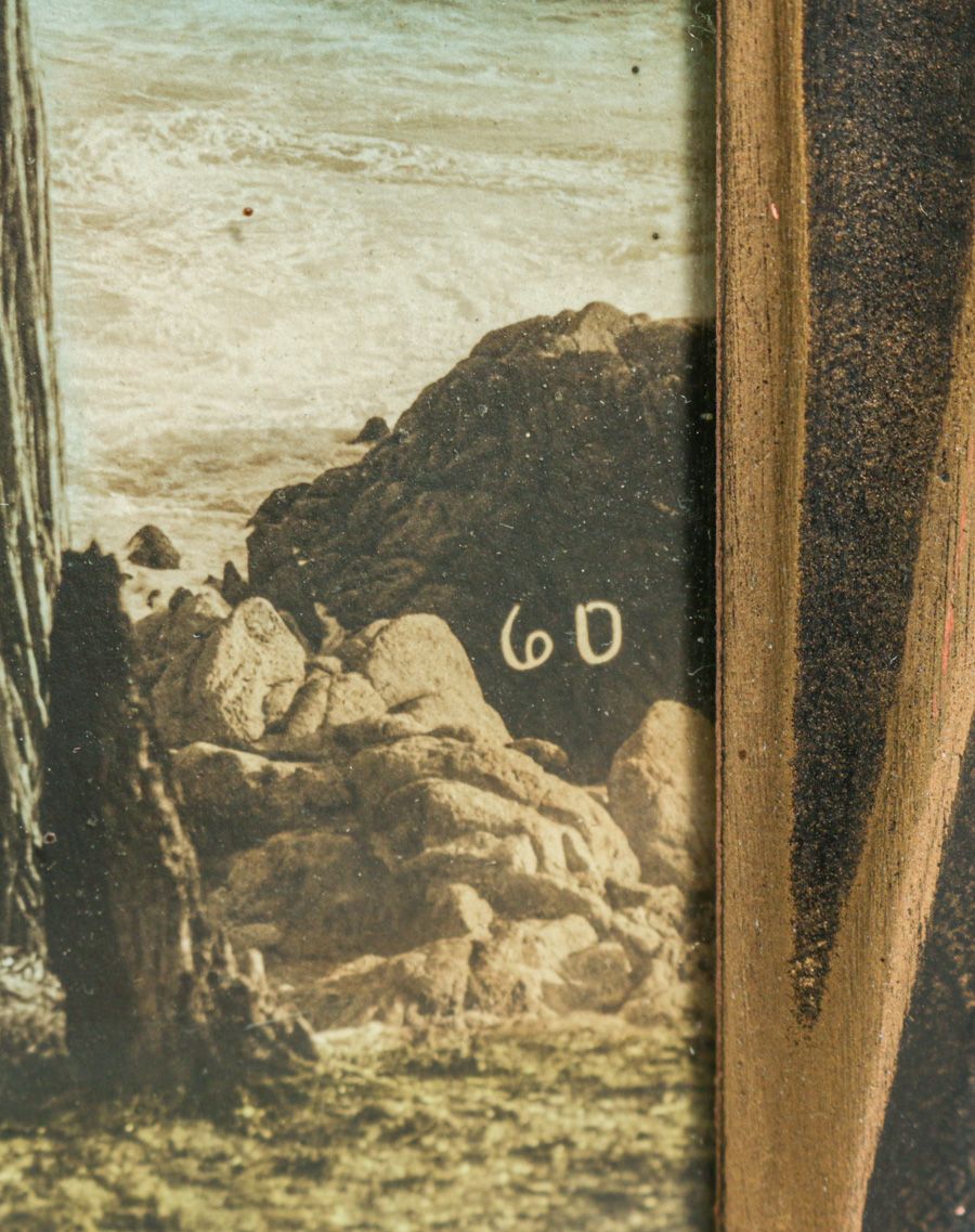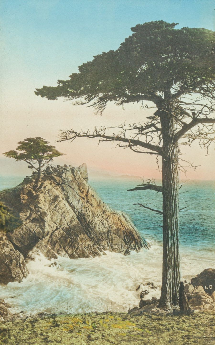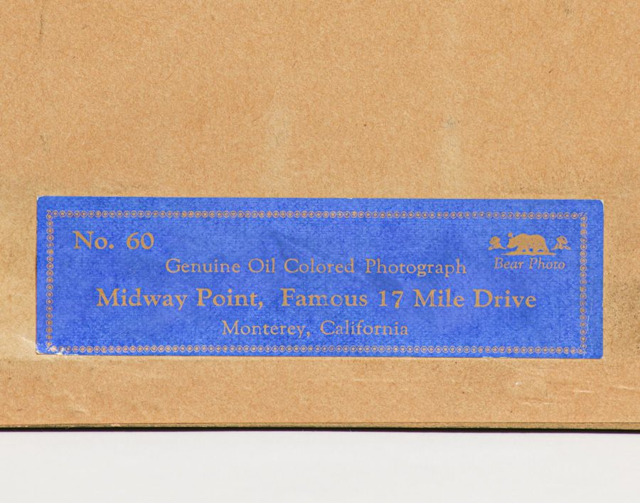21799. California Monterey Cypress Tinted Photo “Midway Point, Famous 17 Mile Drive” c1910. Original label. Some slight pealing to original gesso frame, otherwise excellent condition. 10.5″h x 6.5″w. Frame 12″h x 8″w SOLD